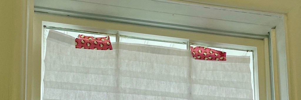 Even before I closed on the house, I bought a bunch of paper blinds, on my parents’ advice to get the windows covered up quickly, for security reasons. And, armed with the blinds and some duct tape I already owned, in a Hello Kitty pattern, I had my awesome friends (who are mostly taller than me) help me get the paper blinds up. A few days later, my family was over, to check out the house, and my nephew (age 8, and very outgoing) kept giggling over the Hello Kitty duct tape!