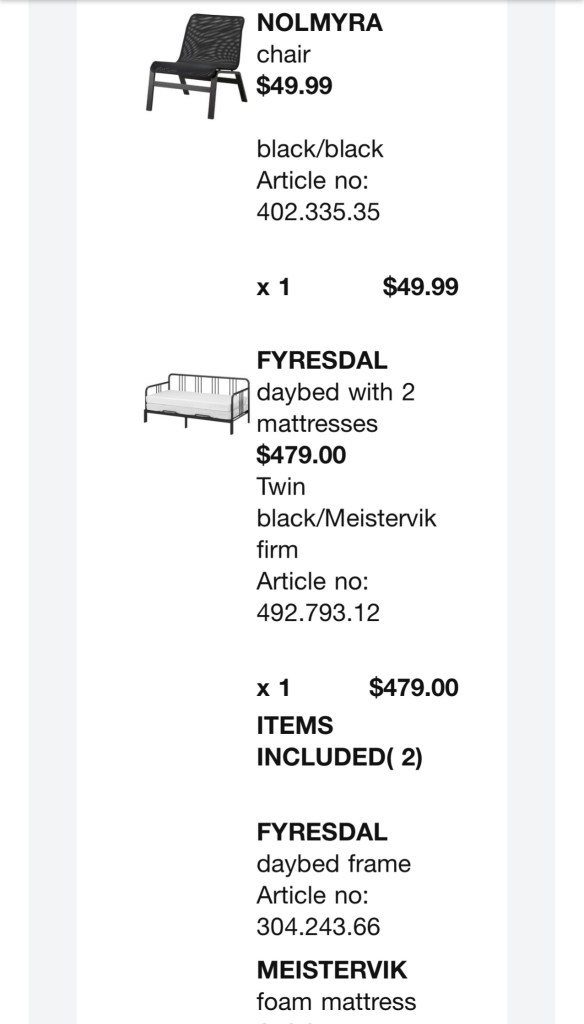 Probably should have revived my Talkspace account instead—it would have been cheaper than the $2,749.61 I spent that night. But my house wouldn’t have been fully furnished with some very cool pieces I had been eyeing up for the past month. From Ikea, I got some chairs, stools (that I would use as endtables), and a guest bedframe and mattresses.
