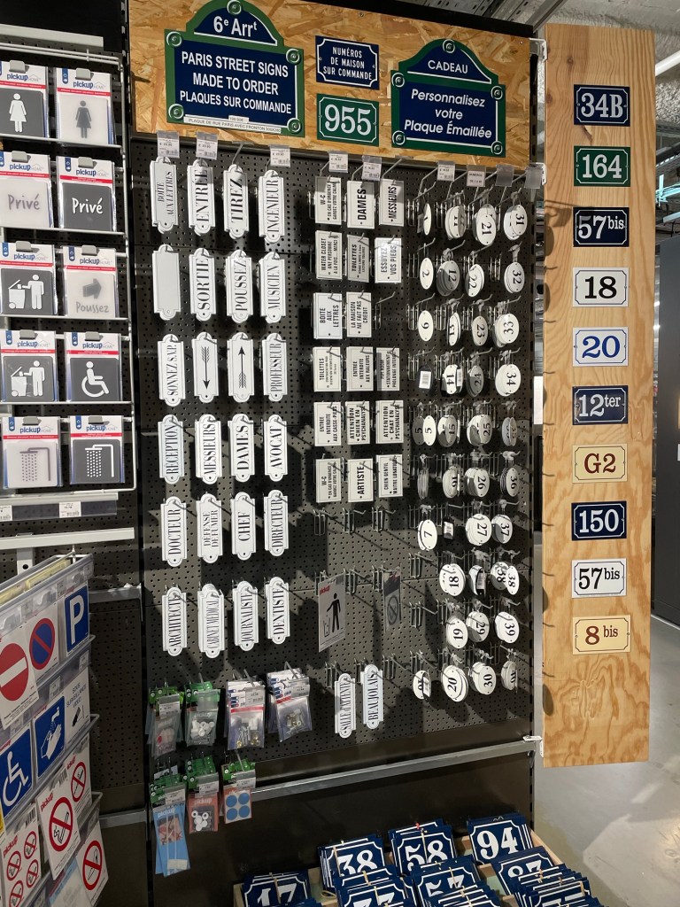 First, I wanted one of those enameled house number signs that are on French buildings, because they have very nice colors and fonts. My house needed more style with its numbers, and they had a blue sign with white numbers, which I knew would match my front door. I also got a small white enameled sign for the bathroom, which I knew would be funny but also very classy.