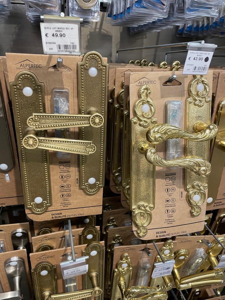 Then I meandered, finally stopping at the aisles of door hardware, mesmerized by all the unique and beautiful brass door levers, wishing that I had space in my tiny suitcase so that I could buy some of them (but it was already packed full of champagne and other souvenirs). I could envision redoing my outside doorknobs with scrolled brass levers, so I took lots of pictures to help plan. And I took pics of some of the tiles they had, because they were rustic and beautiful colors.