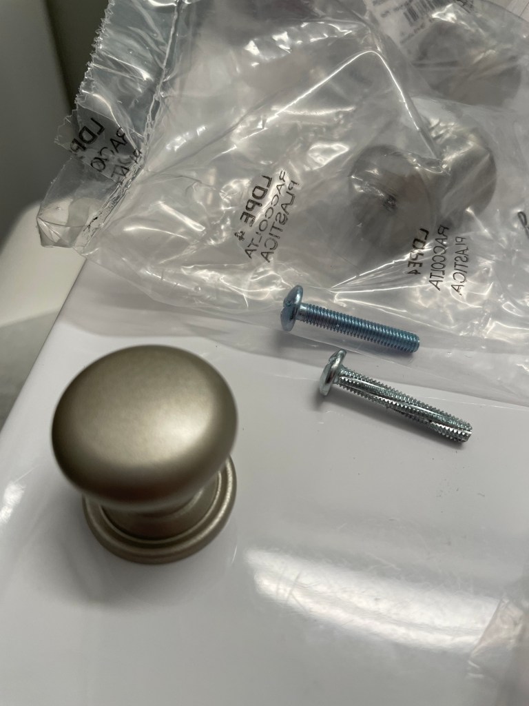 I installed 2 of the cabinet knobs on the bathroom sink cabinet, currently secured with a childproof lock so the puppyraptor can’t get in there. But, I couldn’t get the other 2 cabinet knobs installed on the standing cabinet, because they have REALLY WEIRD screws that look like medieval torture devices, and I kept trying other screws in them but NOTHING will work! It’s really odd. Apparently these are made in Italy, but maybe the Italians rejected them and the French had zero quality control for these cabinet knobs? They were cheap, but I am determined to make them work (maybe with wood dowels and glue?).